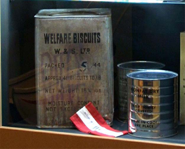Aus einem Nachkriegs-"Care-Paket", Dose "Welfare Biscuits", zwei Dosen "Dry Milk"(Trockenmilch), 1945-1948, SMCA, Inv.-Nr. 2424/95
